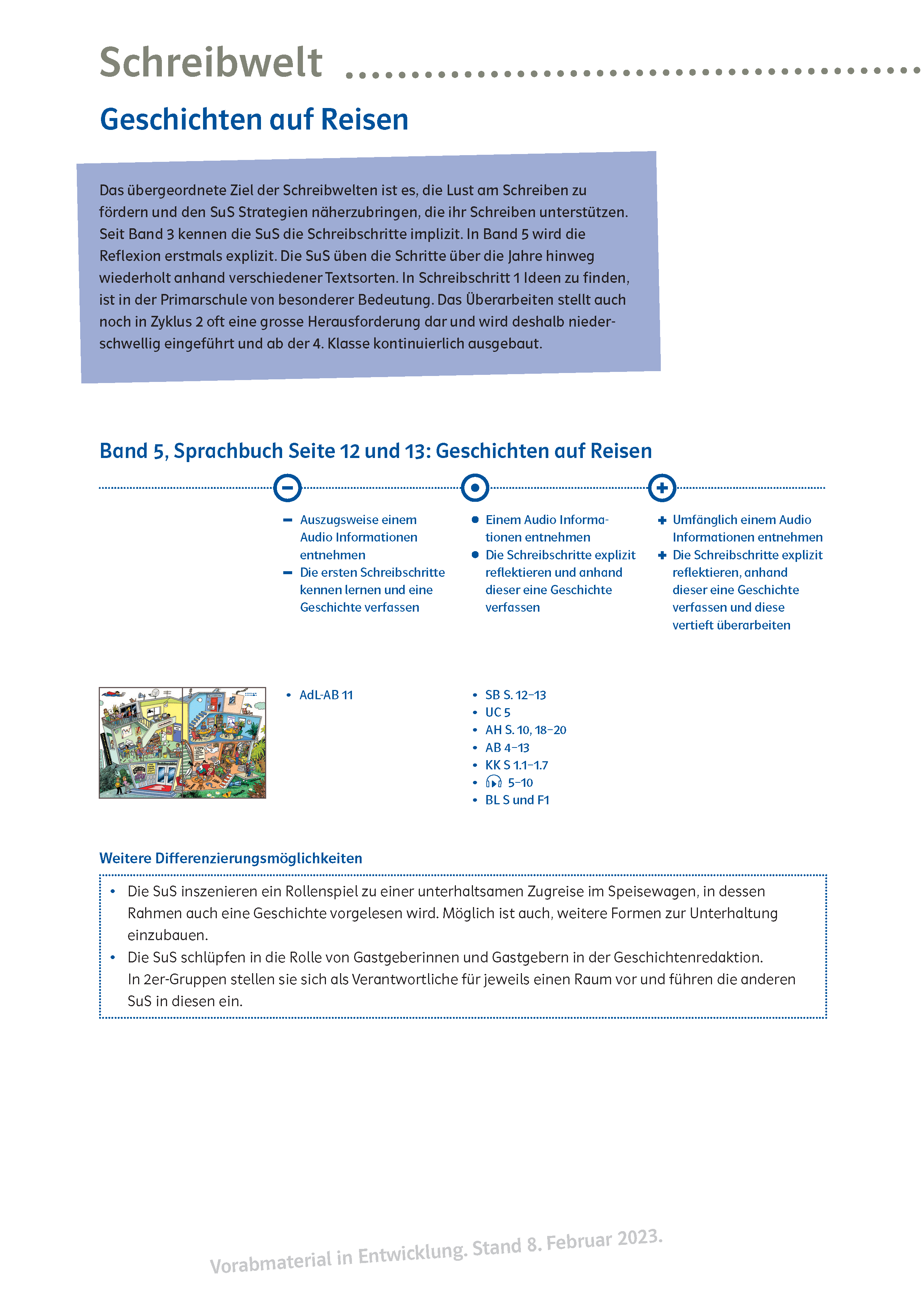 Die Schreibwelt «Geschichten auf Reisen» stammt aus Band 5. Auch hierzu können Sie dem Vorabkapitel eine Reihe von Differenzierungsmöglichkeiten entnehmen.