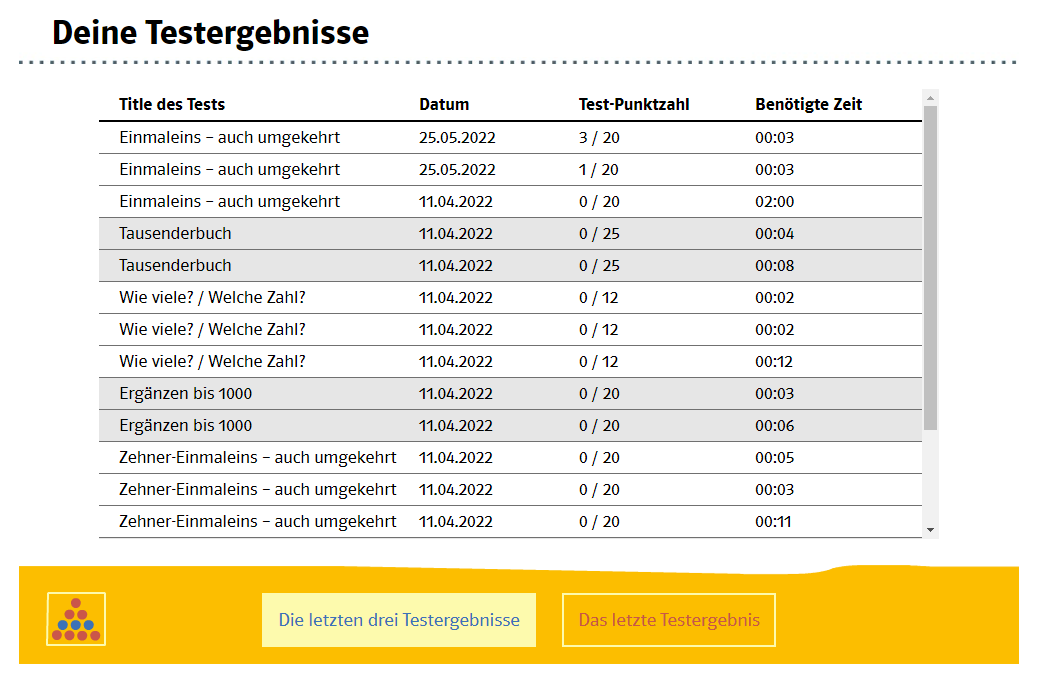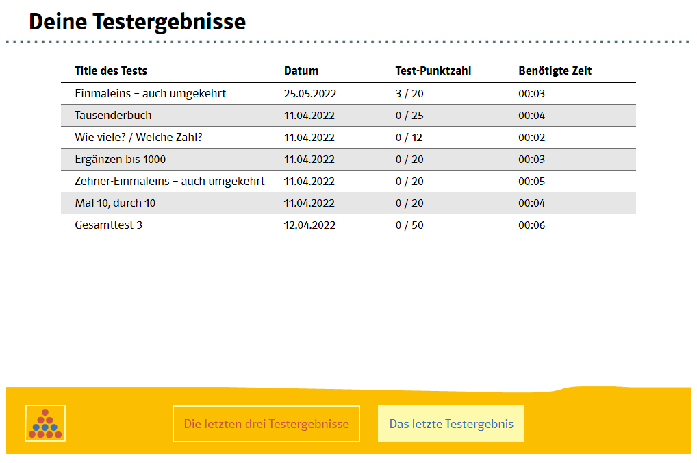 Es sind maximal die letzten drei Resultate eines Kapiteltests sichtbar. Hat die Schülerin oder der Schüler den gleichen Test nur ein- oder zweimal gelöst, sind entsprechend auch nur diese Testresultate aufgeführt.