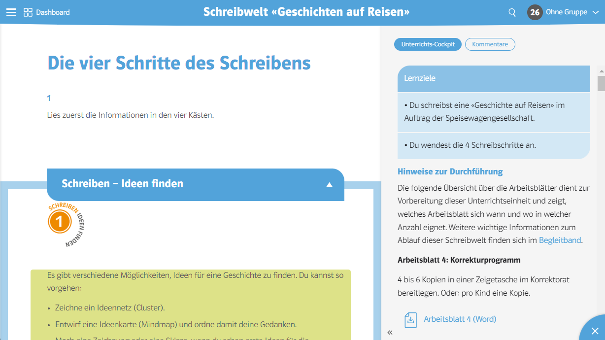 Im Side Panel (in den Unterkapiteln/Themen) lassen sich didaktische Hinweise und Notizen mit Links hinterlegen. Die Navigation geschieht über Haltestellen, die aufzeigen, wo Sie Lernschwerpunkte gesetzt haben.