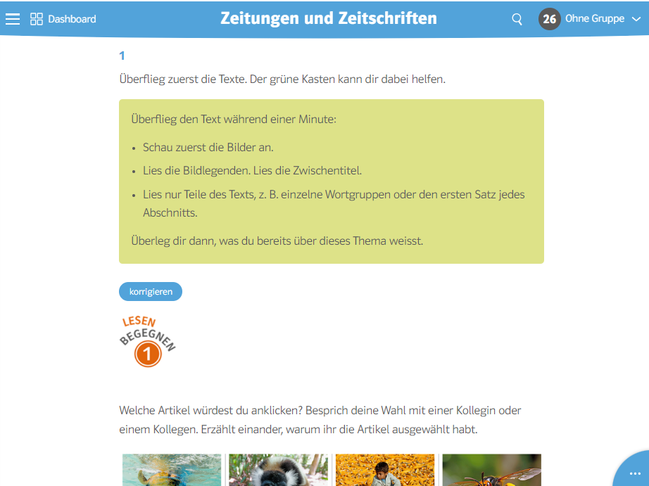 Das digitale Lehrwerksformat bündelt sämtliche Lern- und Arbeitsinhalte an einem Ort: Aufgaben, Audios und Videos, Notizen sowie – in der Ausgabe für Lehrpersonen – die Lösungen und die didaktischen Hinweise. Die Lösungen können den Schülerinnen und Schülern freigegeben werden.