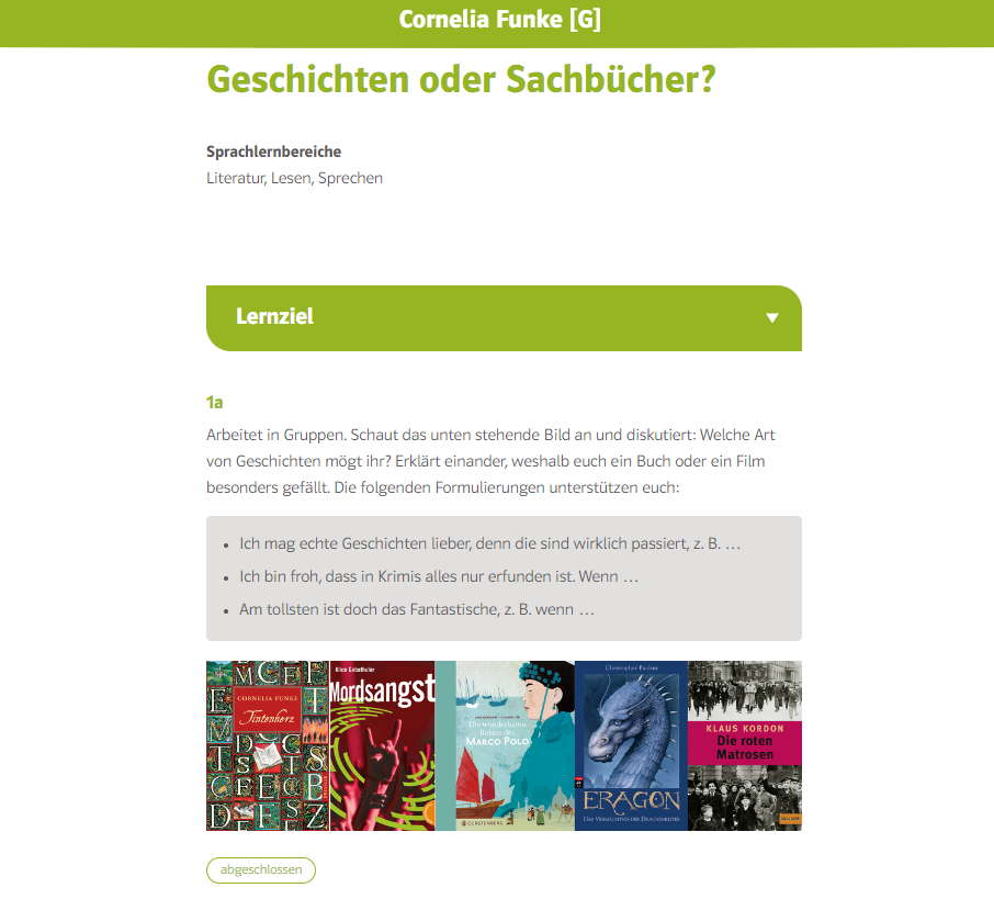 Das digitale Lehrwerksformat bündelt sämtliche Lern- und Arbeitsinhalte an einem Ort: Aufgaben, Audios und Videos, Notizen sowie – in der Ausgabe für Lehrpersonen – die Lösungen und die didaktischen Hinweise. Die Lösungen können den Schülerinnen und Schülern freigegeben werden.