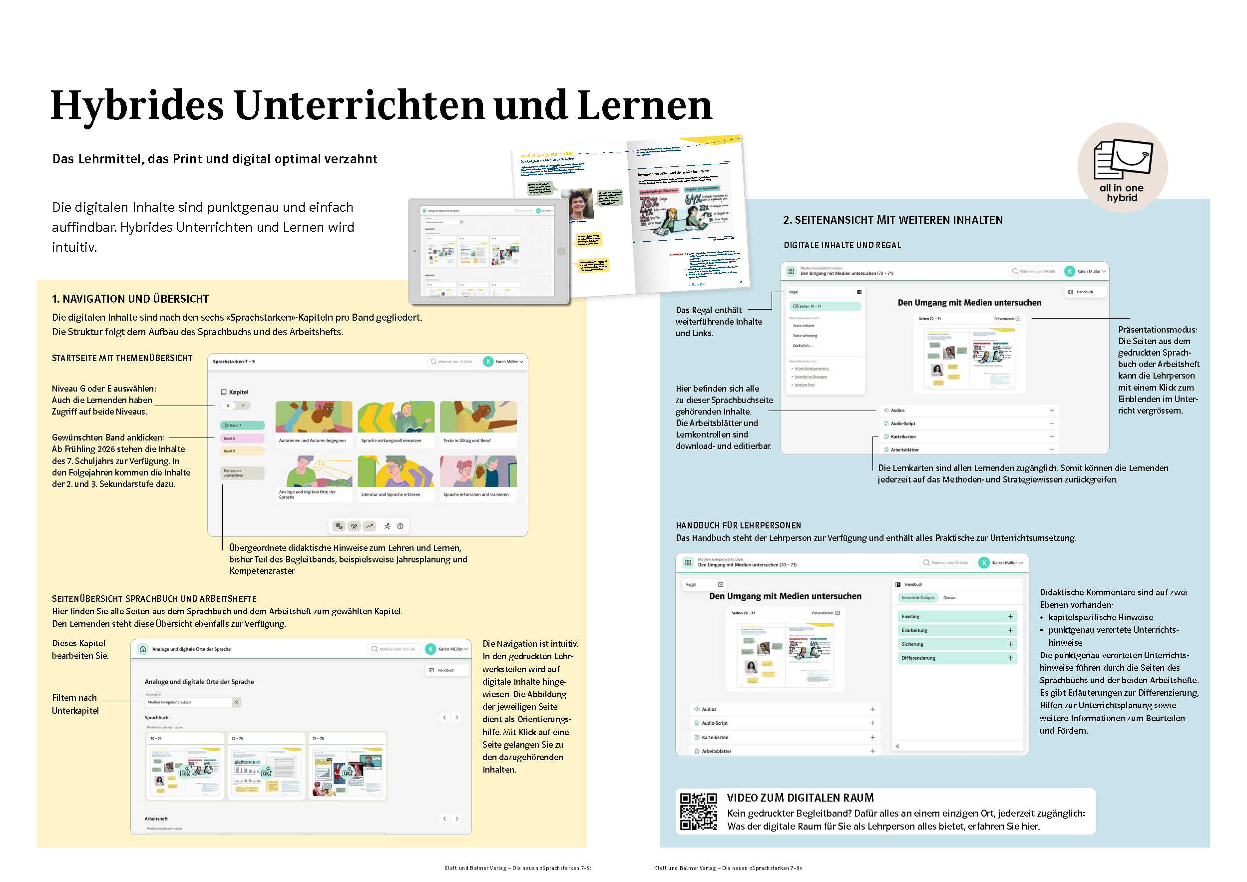 Vom gedruckten Lehrwerksteil geht es direkt zum «Digitalen Raum» auf meinklett.ch. Damit wird hybrides Lernen und Unterrichten umfassend möglich. Lehrpersonen und Lernende finden sich dank des weiterentwickelten Layoutkonzepts und intelligenter Navigation einfach zurecht.