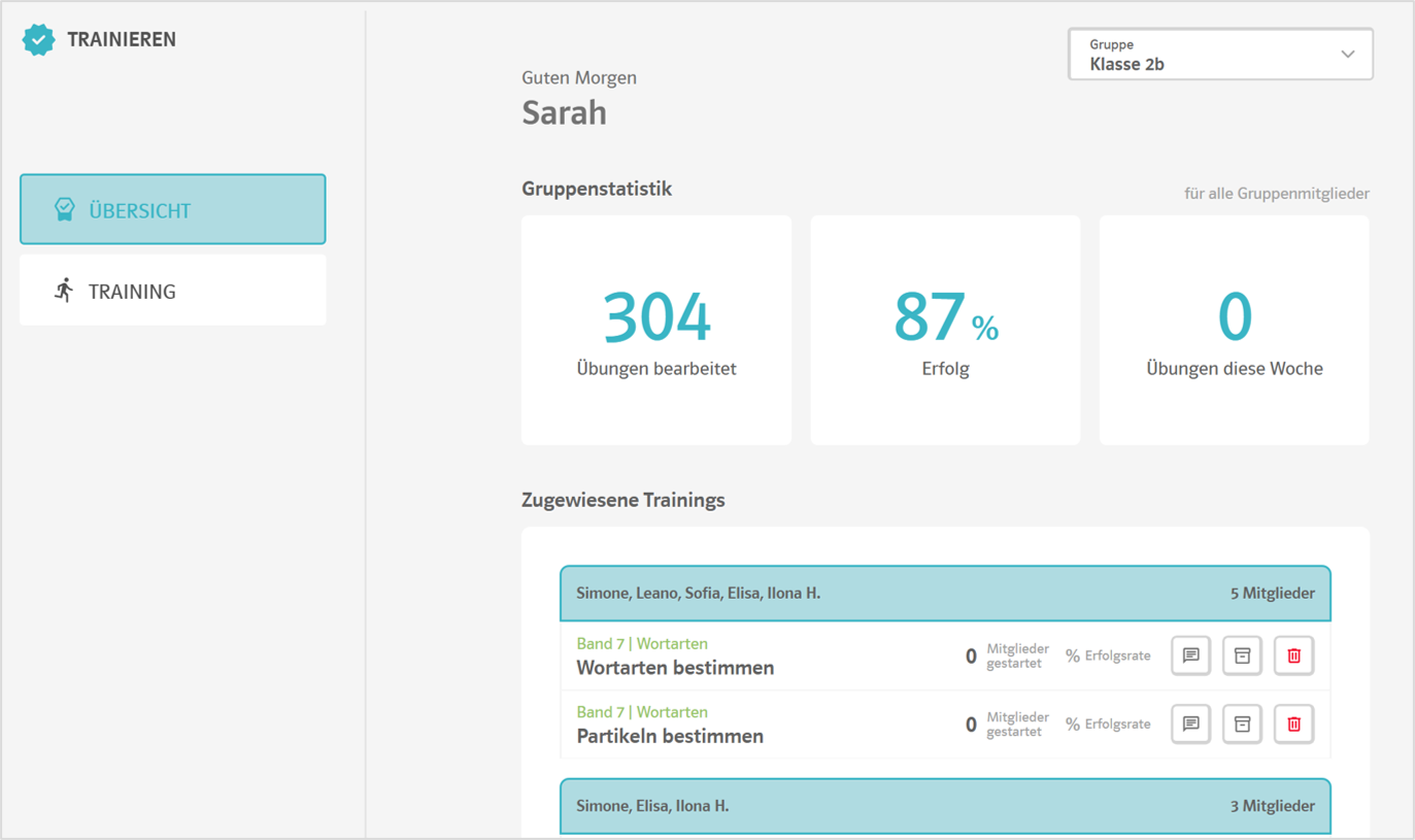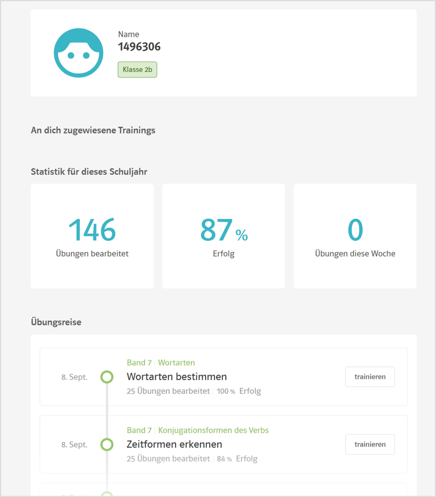 - Trainieren: interaktive Übungen und Dashboard für Schülerinnen und Schüler zur individuellen Lernkontrolle