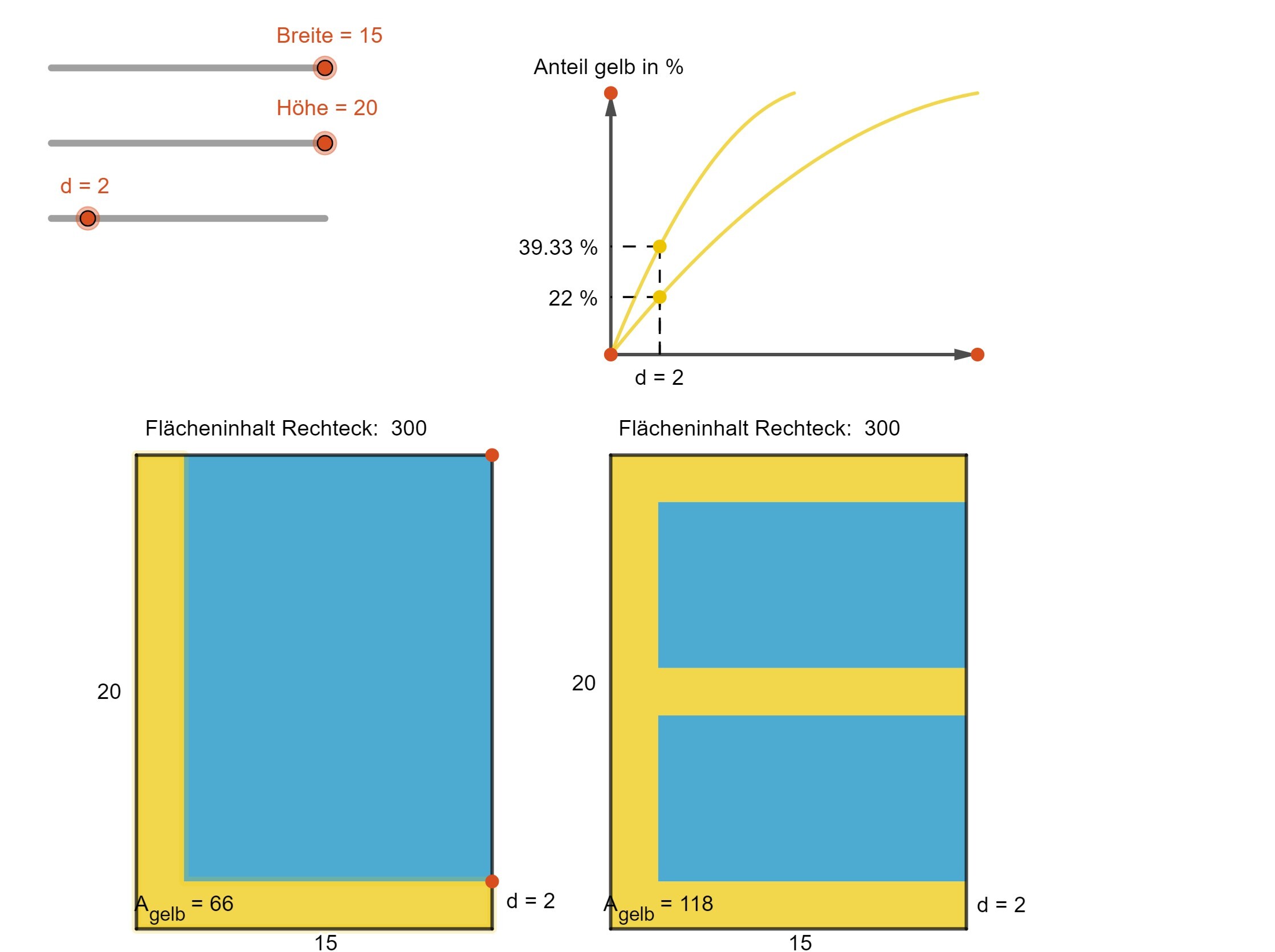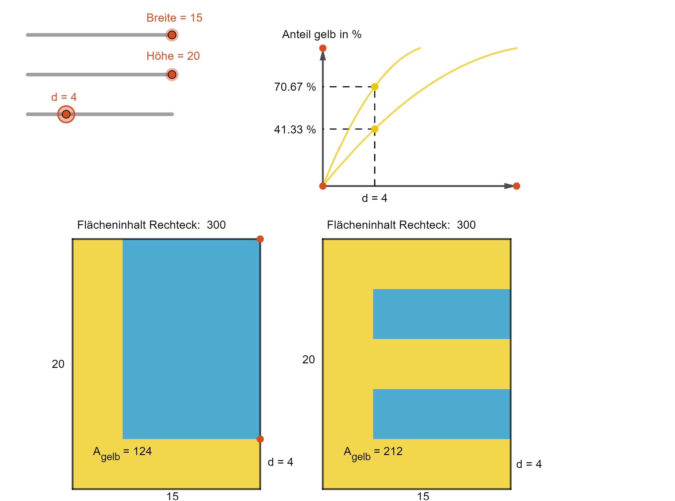 - Auch die Höhe und die Breite der Rechtecke können über die Schieber verändert werden. Der Anteil gelber Farbe am gesamten Rechteck in % wird entsprechend neu berechnet und dargestellt.