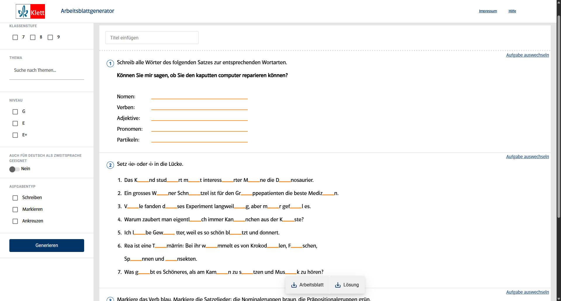 Der Arbeitsblattgenerator bietet der Lehrperson spezifische DaZ-Übungen: