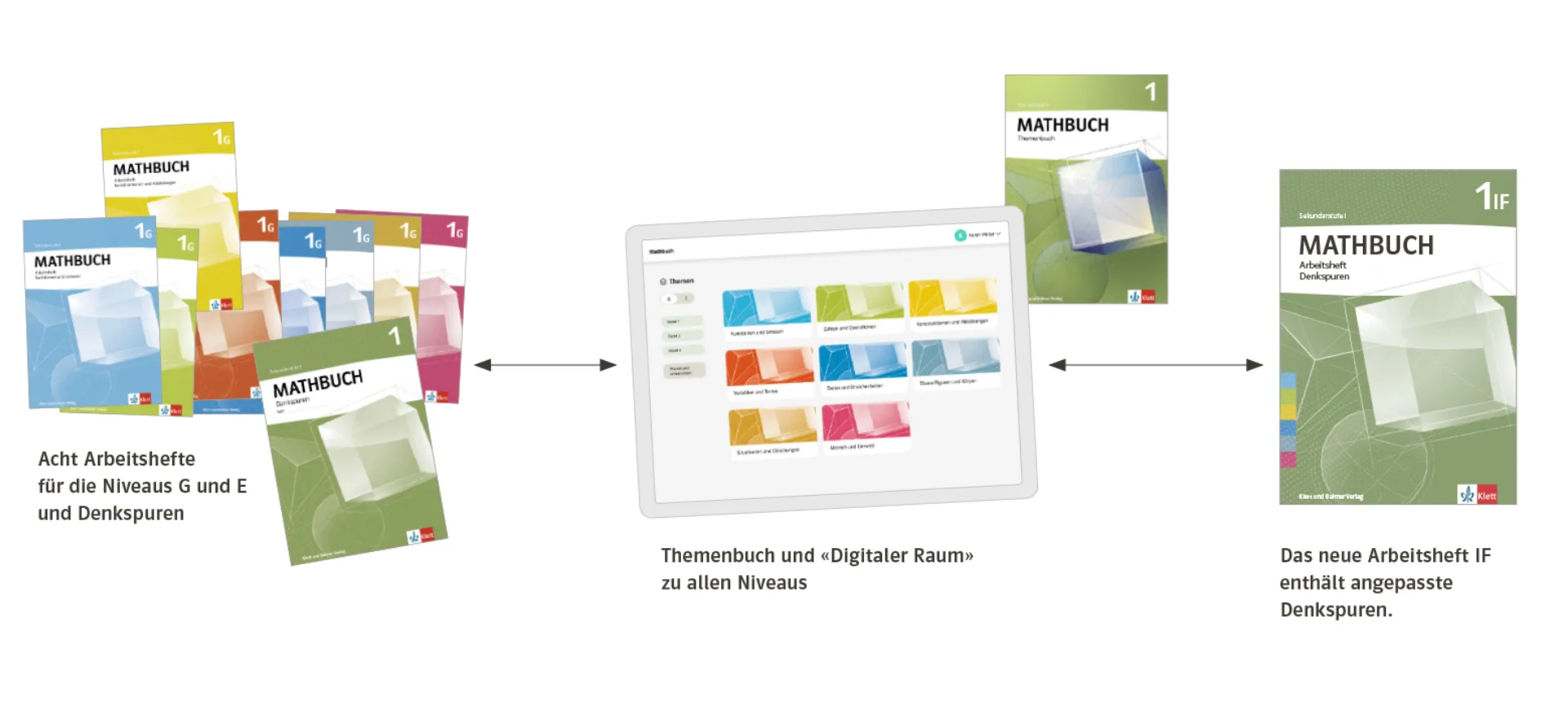 Themenbuch und «Digitaler Raum» stehen im Zentrum des Unterrichts. Ergänzt werden sie mit den acht Arbeitshefte für die Niveaus G und E und den Denkspuren sowie mit dem neuen Arbeitsheft IF. Lernende mit besonderem Förderbedarf können so am Regelunterricht teilnehmen.