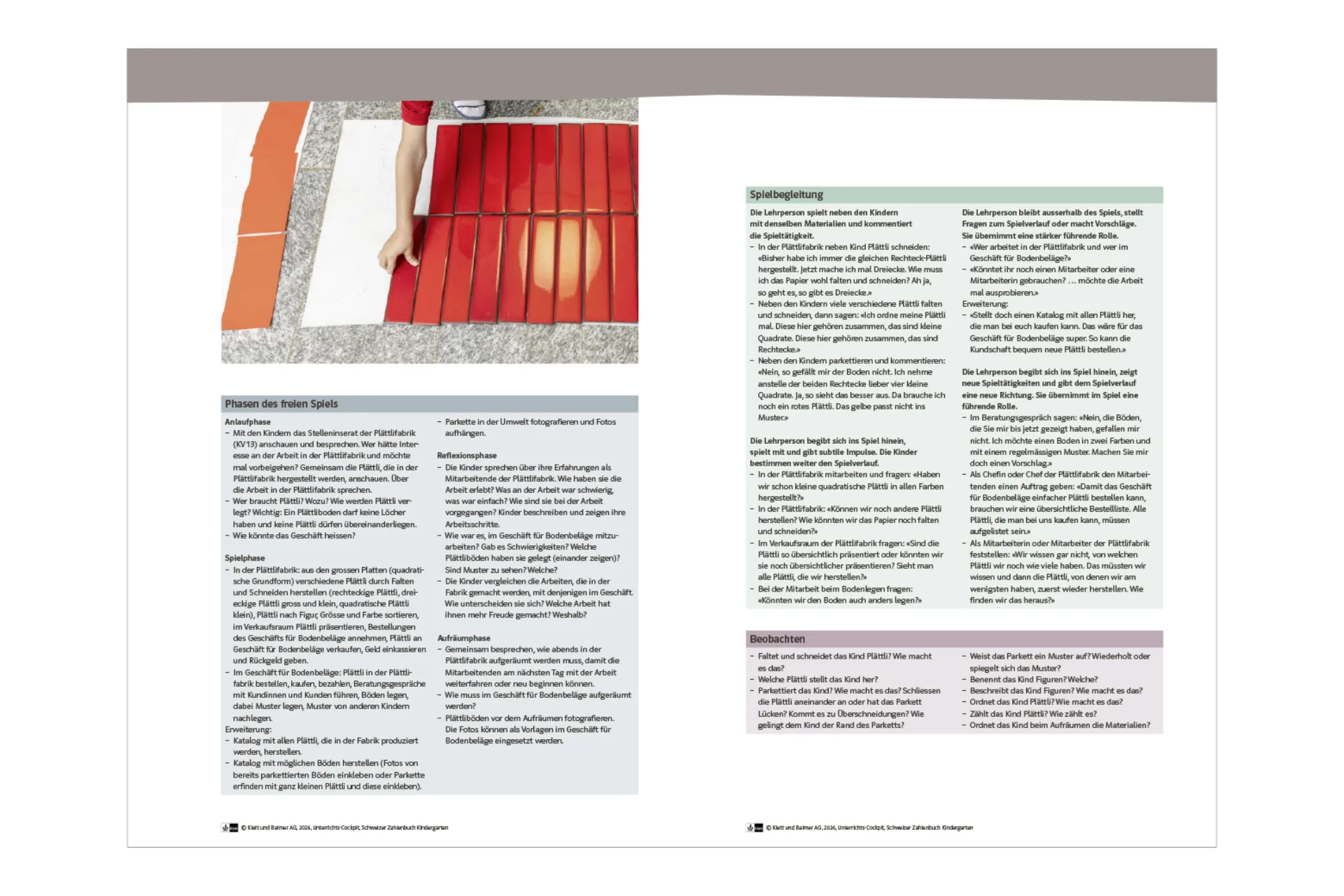 Die Unterrichts-Cockpits bilden das Kernstück des Lehrwerks. Sie fassen alle wichtigen Informationen pro Freispiel-Angebot kompakt auf vier Seiten zusammen und unterstützen Sie bei der Planung, Durchführung, Begleitung und Beobachtung des freien Spiels. Die Abbildungen zeigen exemplarisch das Unterrichts-Cockpit für das Freispiel «Plättlifabrik».