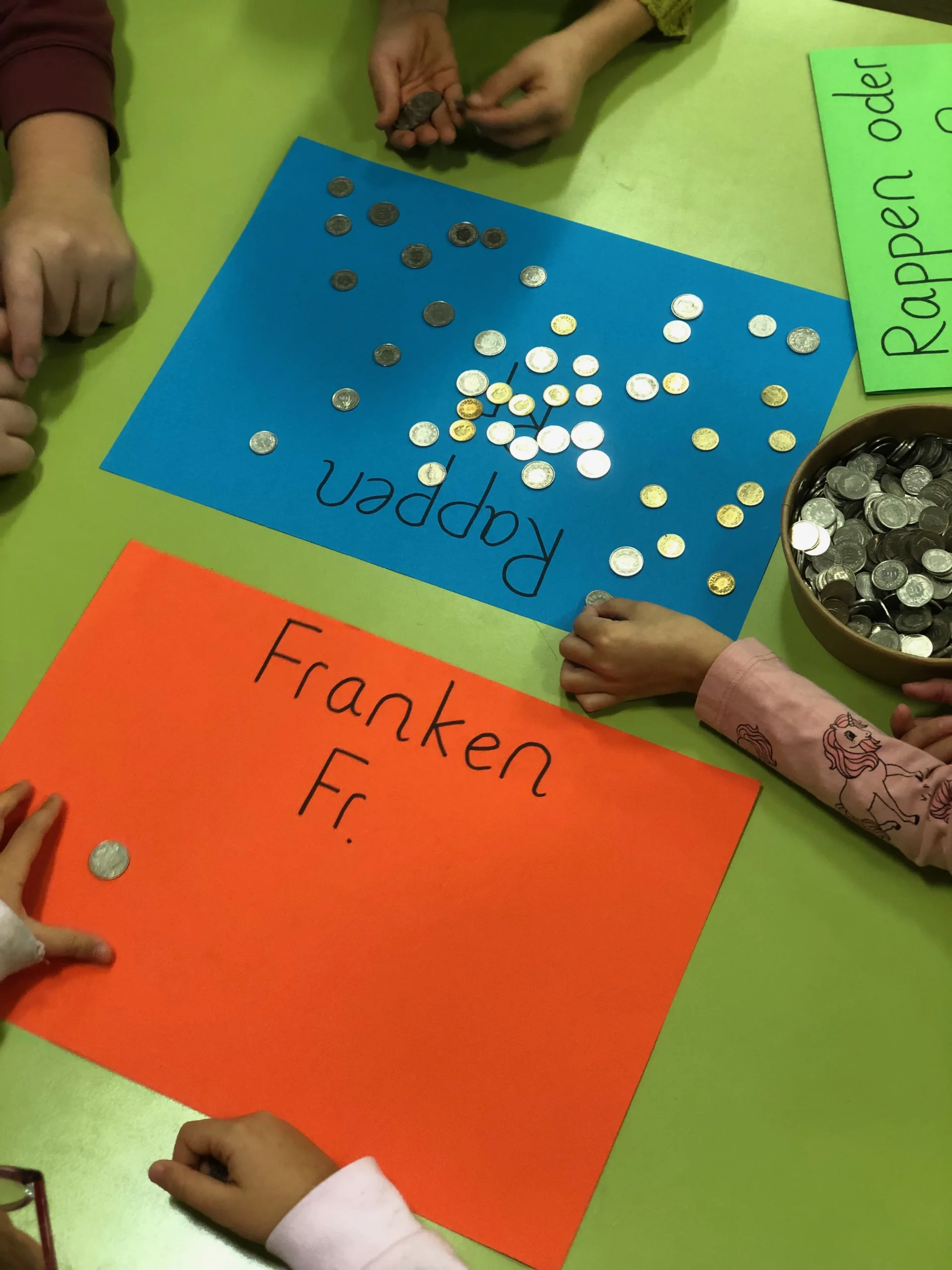 Wir springen zum nächsten Unterrichtstag – nun auf Deutsch. Die internationalen Hintergründe der Kinder werden miteinbezogen und die Lernenden betrachten verschiedene Währungen auf der Weltkarte: Wo gibt es den Franc? Was ist ein Pound, was ein Dollar?