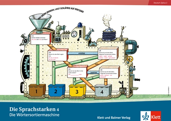 Diese Wörtersortiermaschine ist Teil des Sprachbuchs der «Sprachstarken 4». Sie unterstützt junge Sprachforscher und -forscherinnen bei der Zuteilung von Wörtern in Nomen, Verben, Adjektive und restliche Wörter.