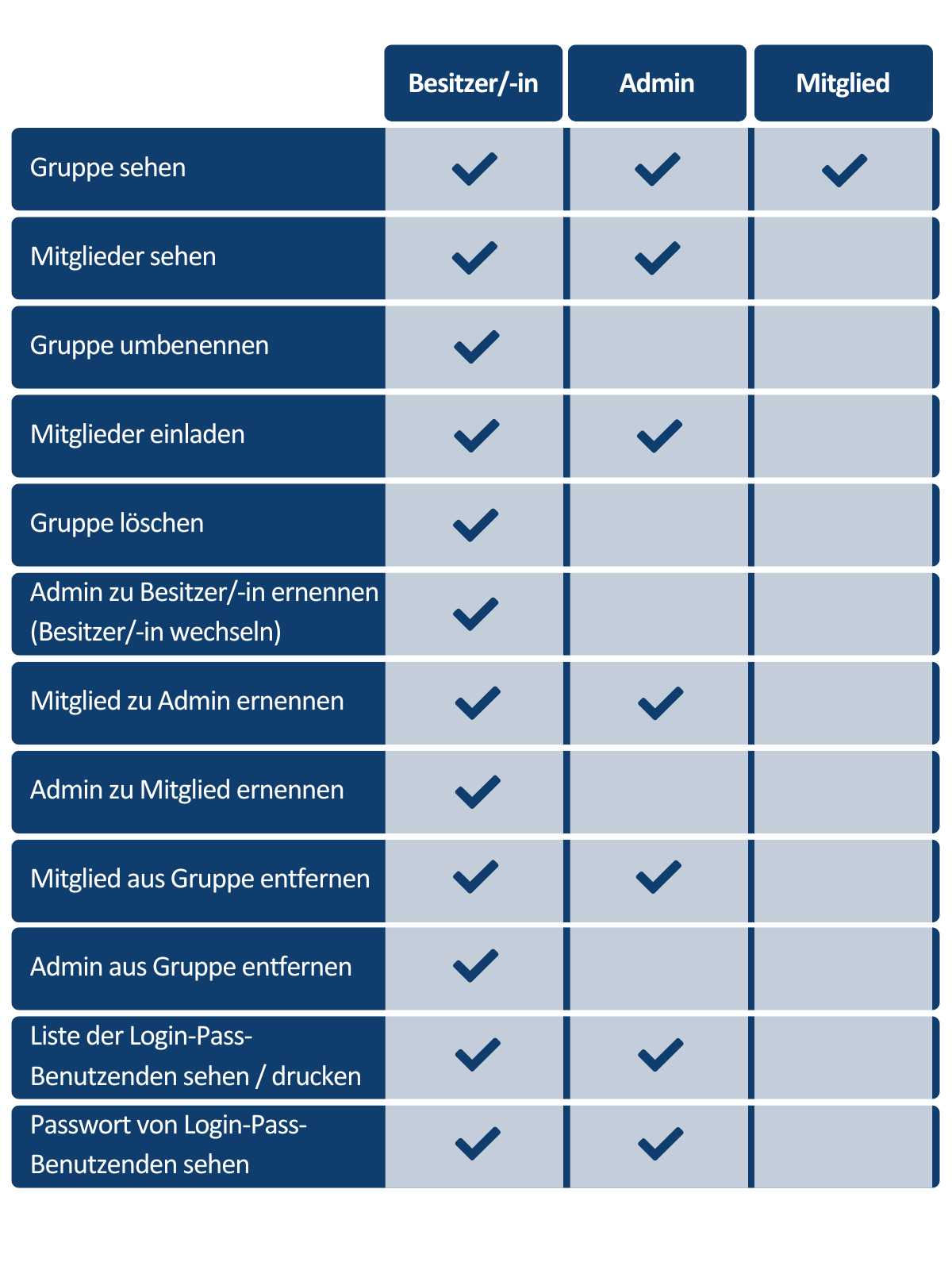 Die Person, die die Gruppe erstellt, ist die «Besitzerin» oder der «Besitzer». Damit verfügt diese Person über die Funktionen, Login-Pässe zu erstellen, Mitglieder aus der Gruppe zu entfernen und weitere einzuladen, Rollen innerhalb der Gruppe zuzuweisen, die Gruppe umzubenennen oder zu löschen. - Admin: