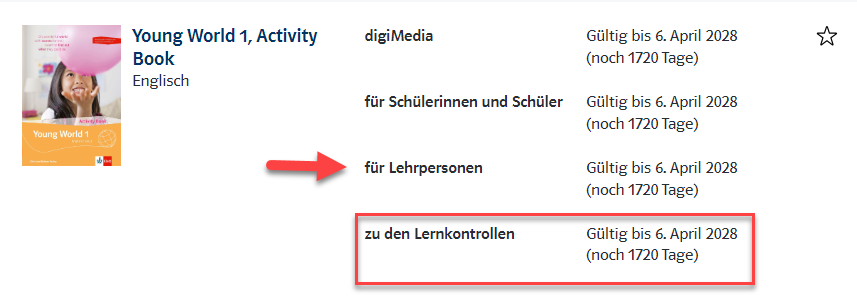 In einigen Lehrwerken bilden die Lernkontrollen einen eigenen Lehrwerksteil und müssen separat gekauft und anschliessend gesondert freigeschaltet werden. Folgender Screenshot zeigt, wie es unter «Meine Inhalte» korrekterweise aussieht, wenn die Lernkontrollen zur Verfügung stehen.