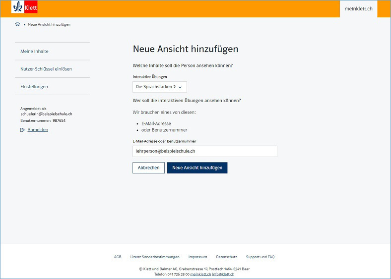 Bei den meisten interaktiven Übungen können Ihnen Ihre Schülerinnen und Schüler Einblick in ihren Lernstand geben, indem sie auf den Button «Ansicht ermöglichen» klicken. Bisher mussten die Lernenden dafür die sechsstellige Benutzernummer der Lehrperson eingeben. Neu ist es auch möglich, die E-Mail-Adresse einzutippen.