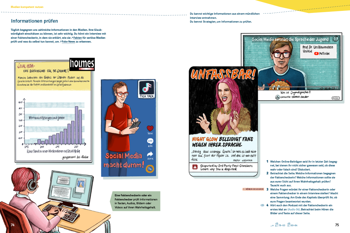 In diesem Kapitel erfahren die Schülerinnen und Schüler viel über Informationen aus dem Internet und lernen dabei Wichtiges zum Thema «Fakten checken». Die Lernenden üben Strategien ein, die ihnen helfen, Informationen aus Texten und Diagrammen zu filtern und diese kritisch zu prüfen.